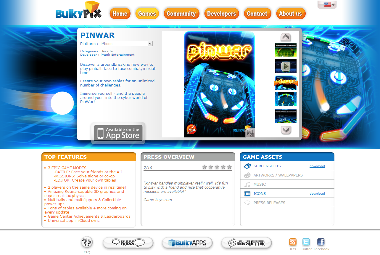 PinWar is a competitive pinball game in which, rather than taking turns, two players (or a player and AI) control opposite sides of a table. Flippers exist at both ends, enabling each player to defend their drain and try to make the opponent let the ball through. BulkyPix seems to be marketing it as an evolution of pinball with two pinball games tables put together. You could also see it as an evolution of pong or breakout with flippers replacing paddles and new features added to the table. Regardless, PinWar uses many familiar mechanics in new ways… I’m a big fan of iterating on classic games, and PinWar does this well. While it borrows from many different games, it combines them in a unique way.