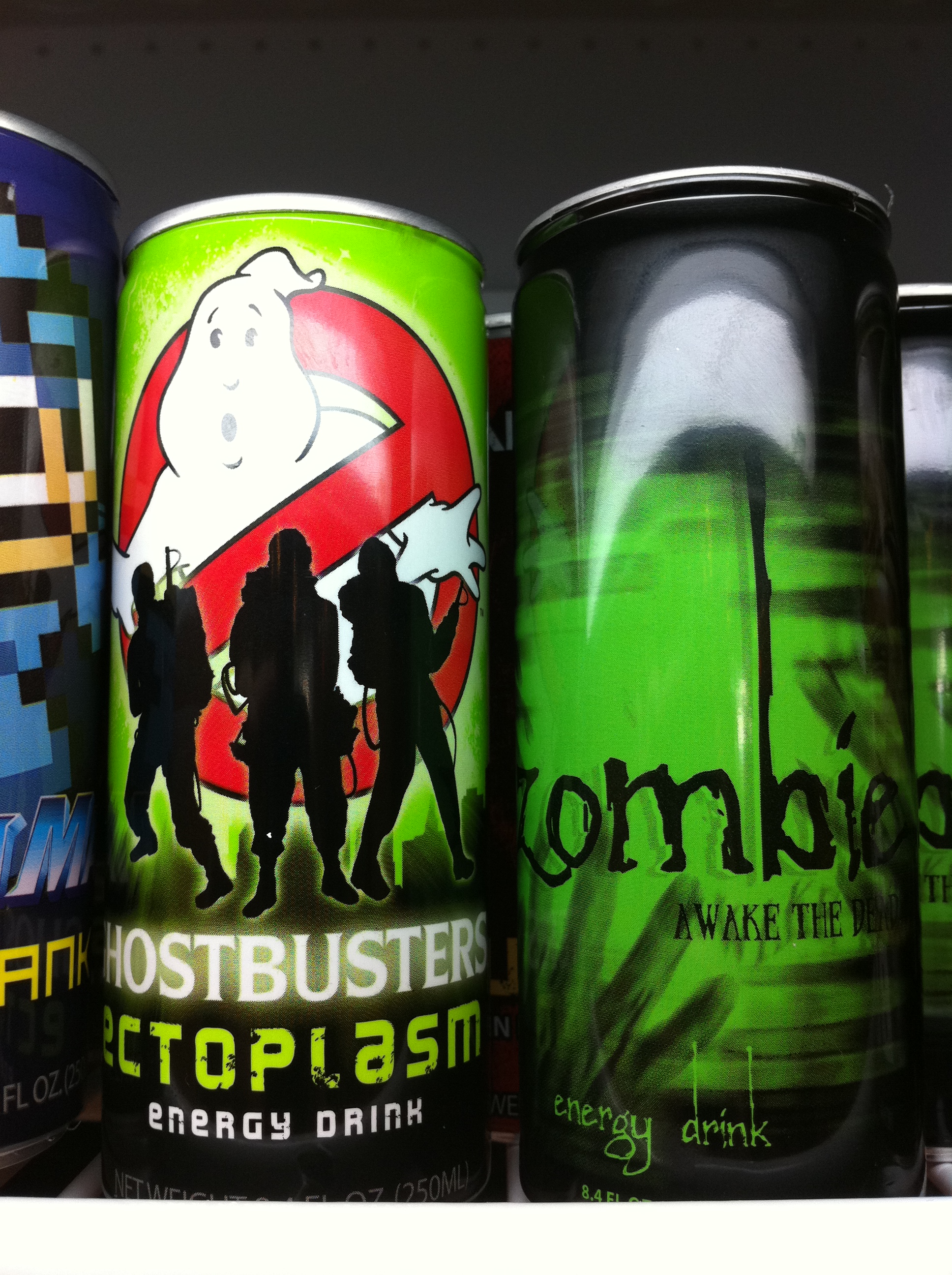 Well, these aren’t actually game-themed, but I thought they were cool too. The Ghostbusters energy drink is supposedly ectoplasm, and there’s a zombie energy drink too!