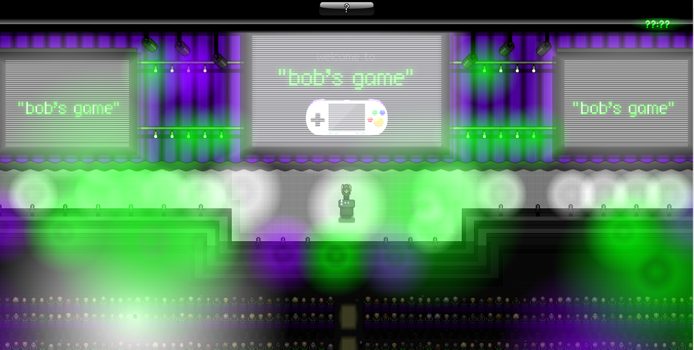 After getting out of the elevator, I lose control again. Bob walks down a hallway and past a large room with many people. Lights come on, and Bob is standing in front of a room full of people watching him on stage. It appears to be the interdimensional bob’s bame tournament that was to be part of bob’s game.